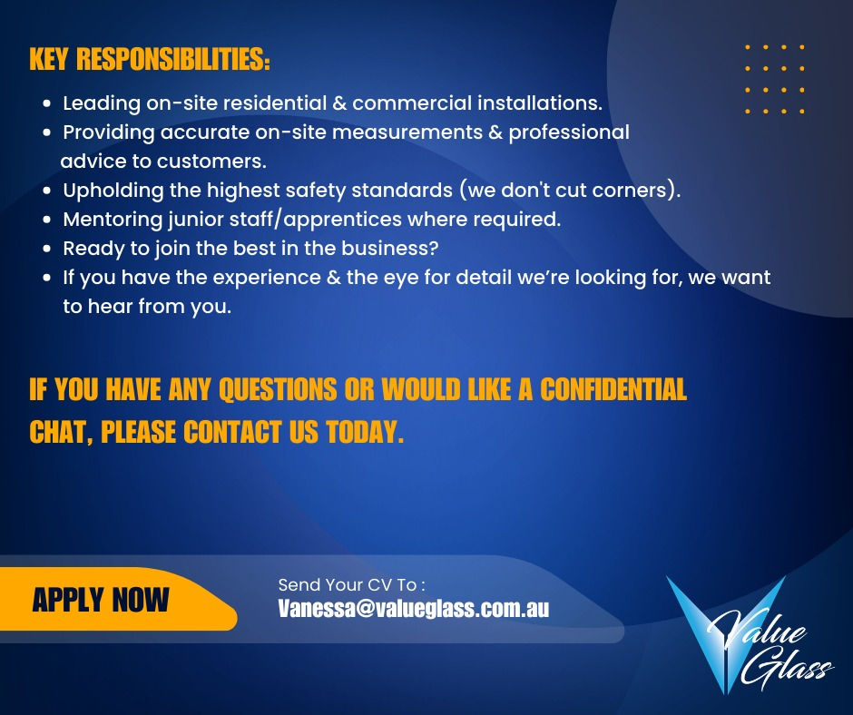Value Glass is looking for dedicated professionals to join our growing team. We pride ourselves on a culture of safety, mentorship, and excellence in the glazing industry.